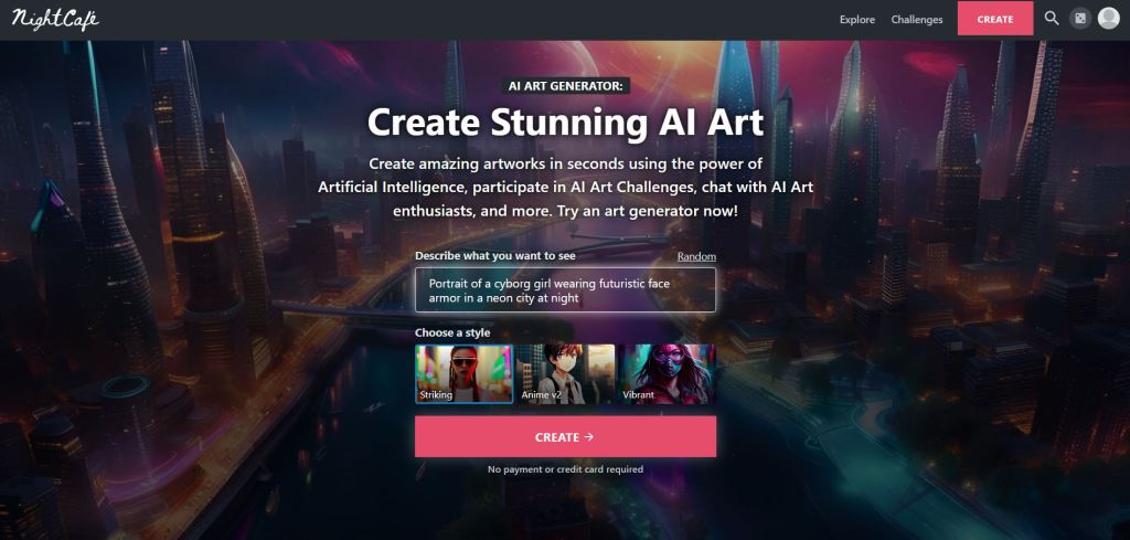 NightCafe is one of the big names in the world of AI art generators. It’s known for having more algorithms and options than other generators. Night Cafe is the one where creative freedom knows no bounds. With ownership of your creations at the core, this platform empowers artists with an array of features. Unleash your imagination with an extensive selection of algorithms surpassing other generators. Enjoy granular control for advanced users, while participating in the community can earn you valuable credits. It organizes your artwork into collections and effortlessly bulk-download your images. It has a generous free tier, and plenty of options to “earn” credits by participating in the community.